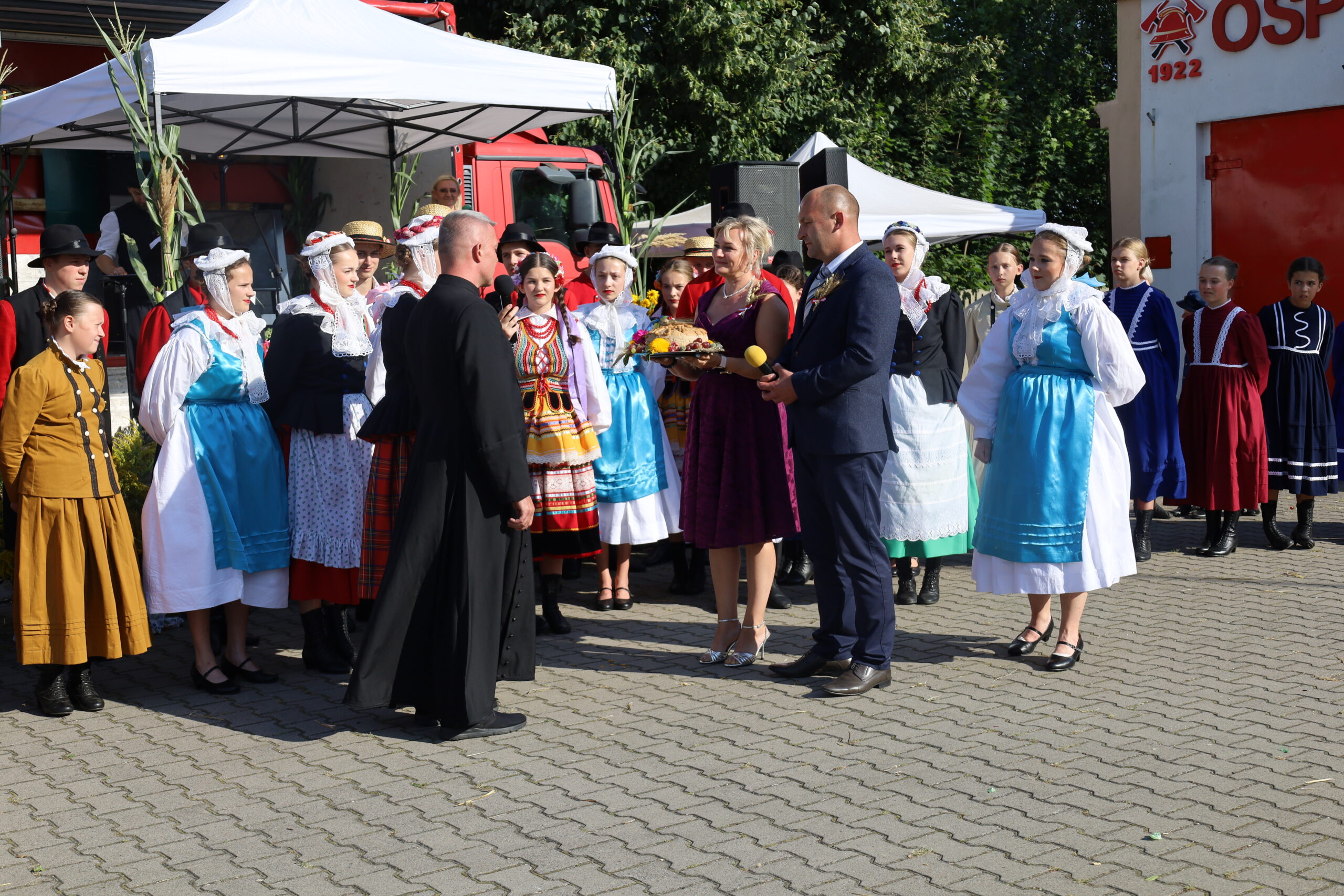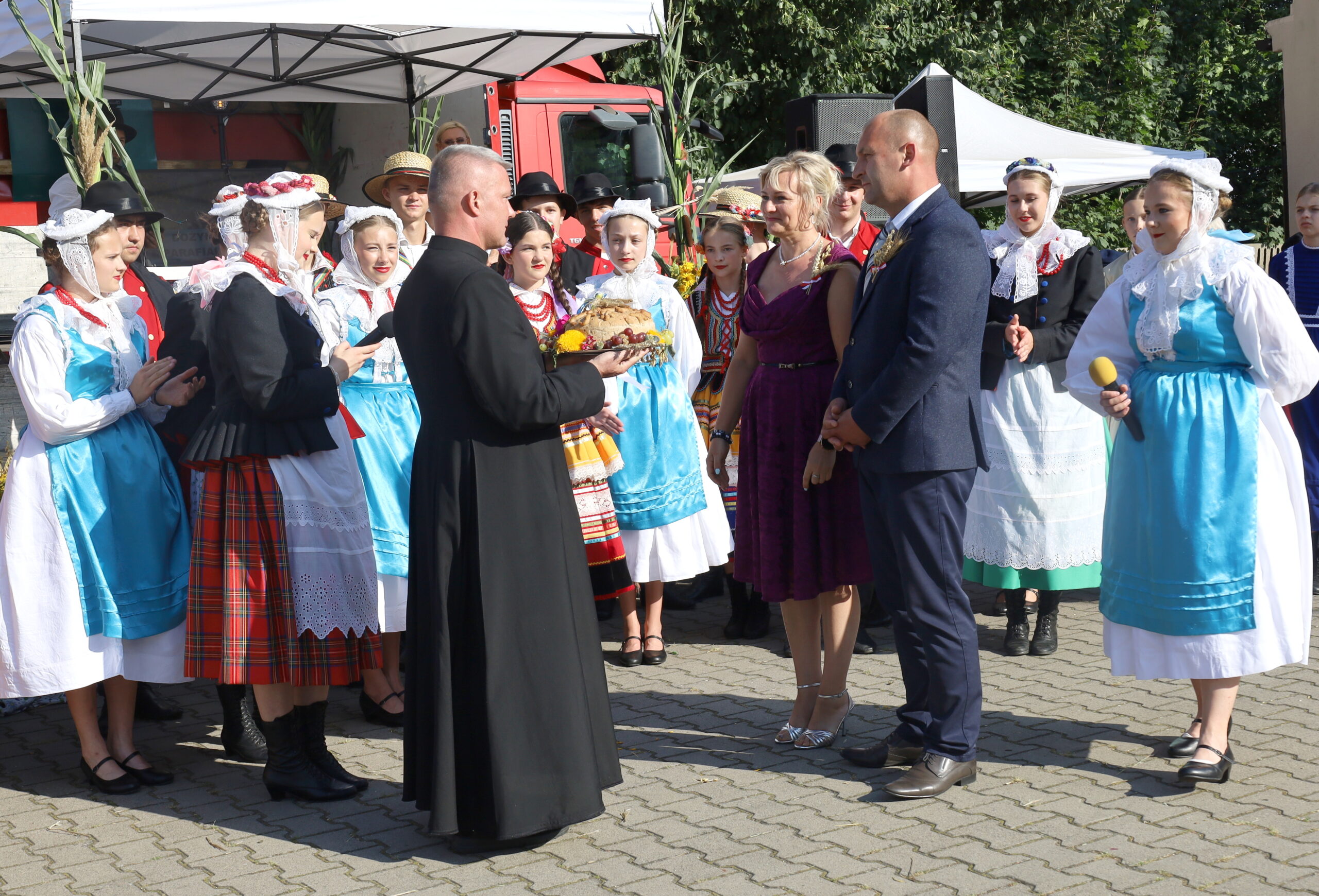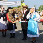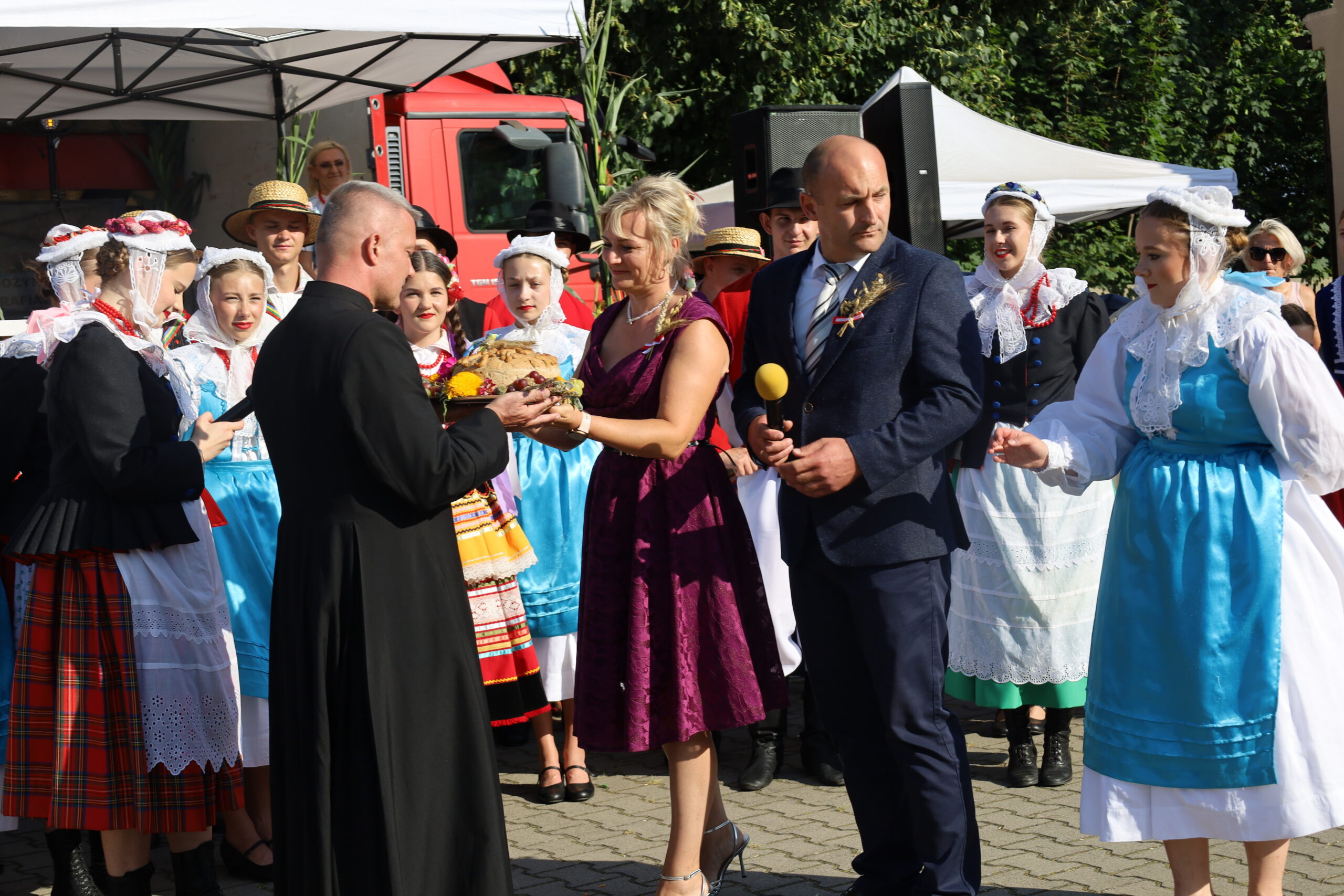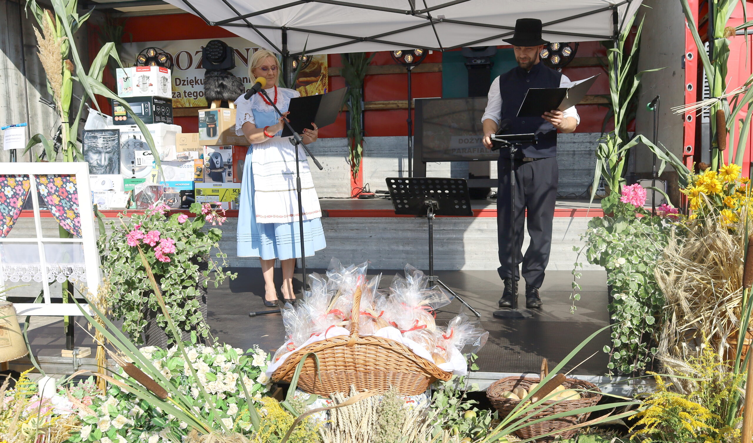 Uroczystość dożynkową prowadzili: Ada Białkowska w tradycyjnym stroju biskupiańskim oraz Krzysztof Popłonek w stroju raszkowskim.