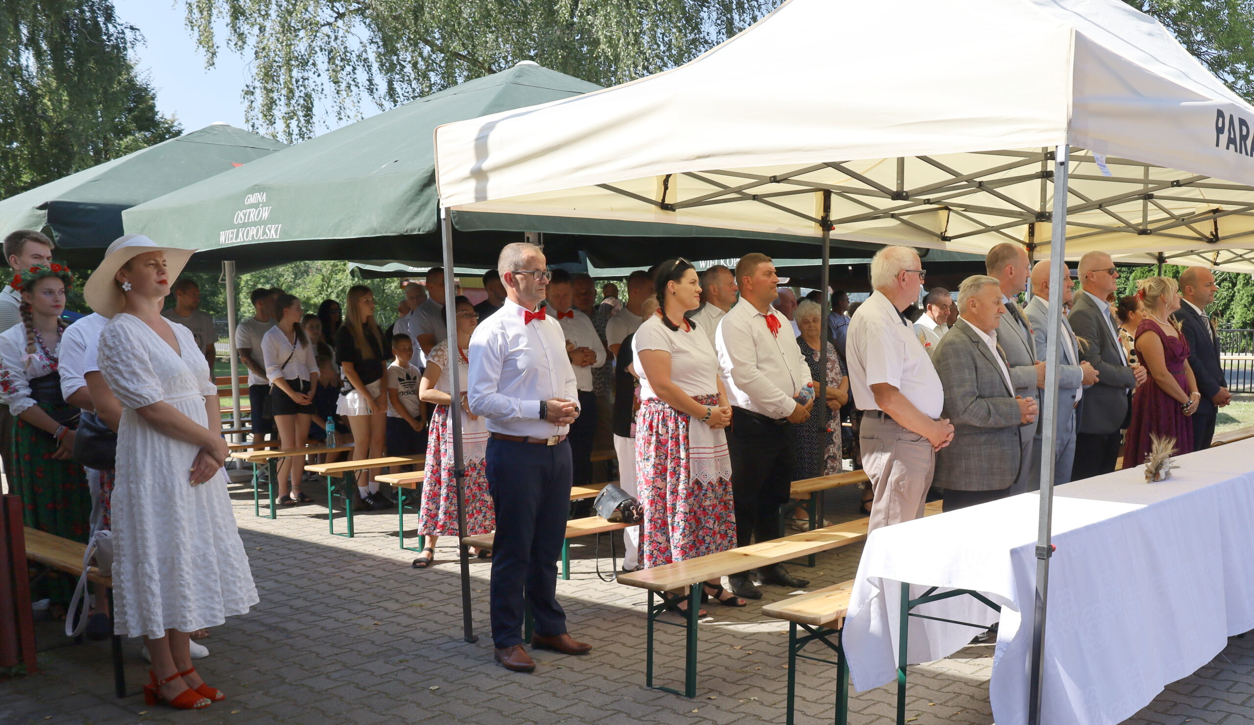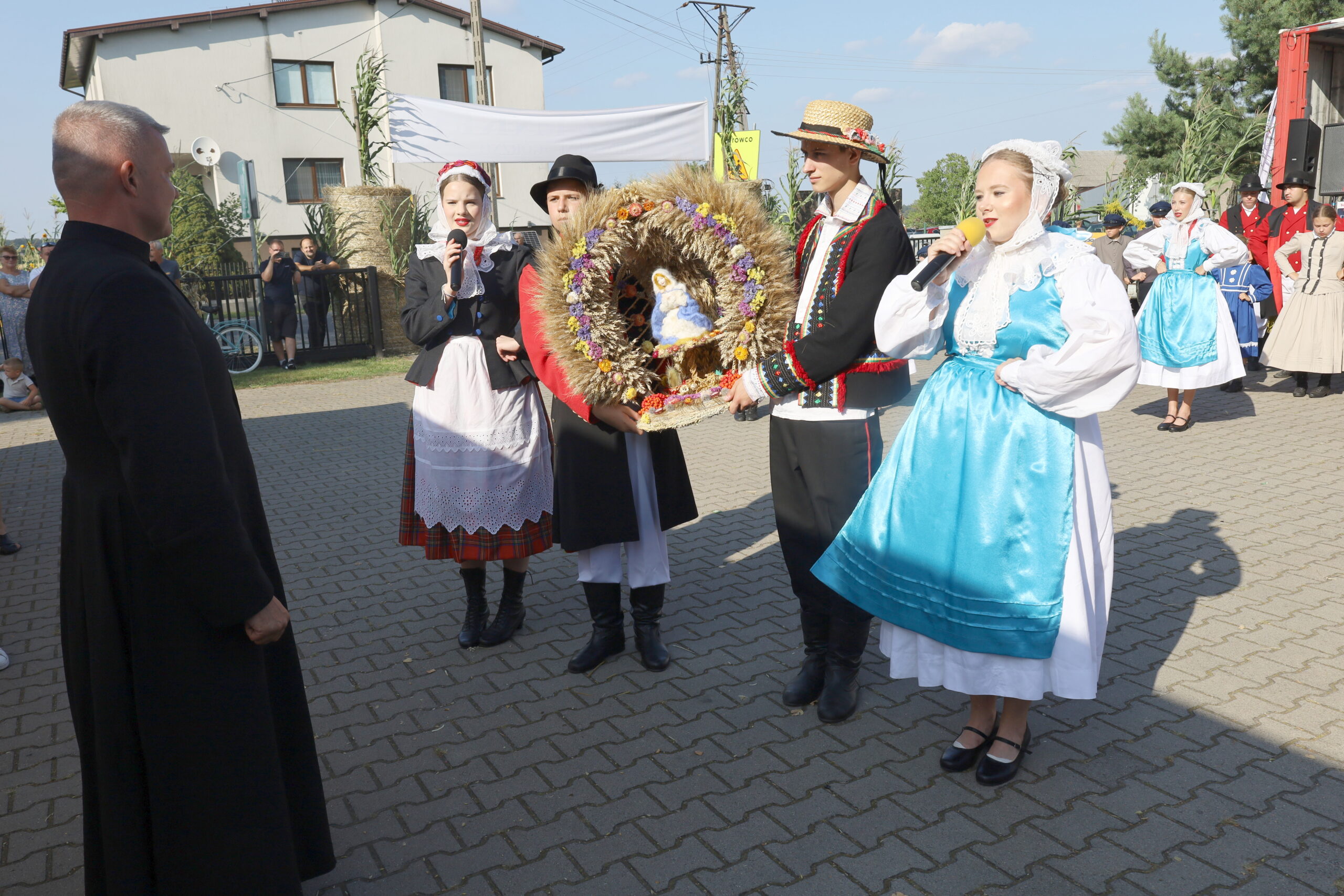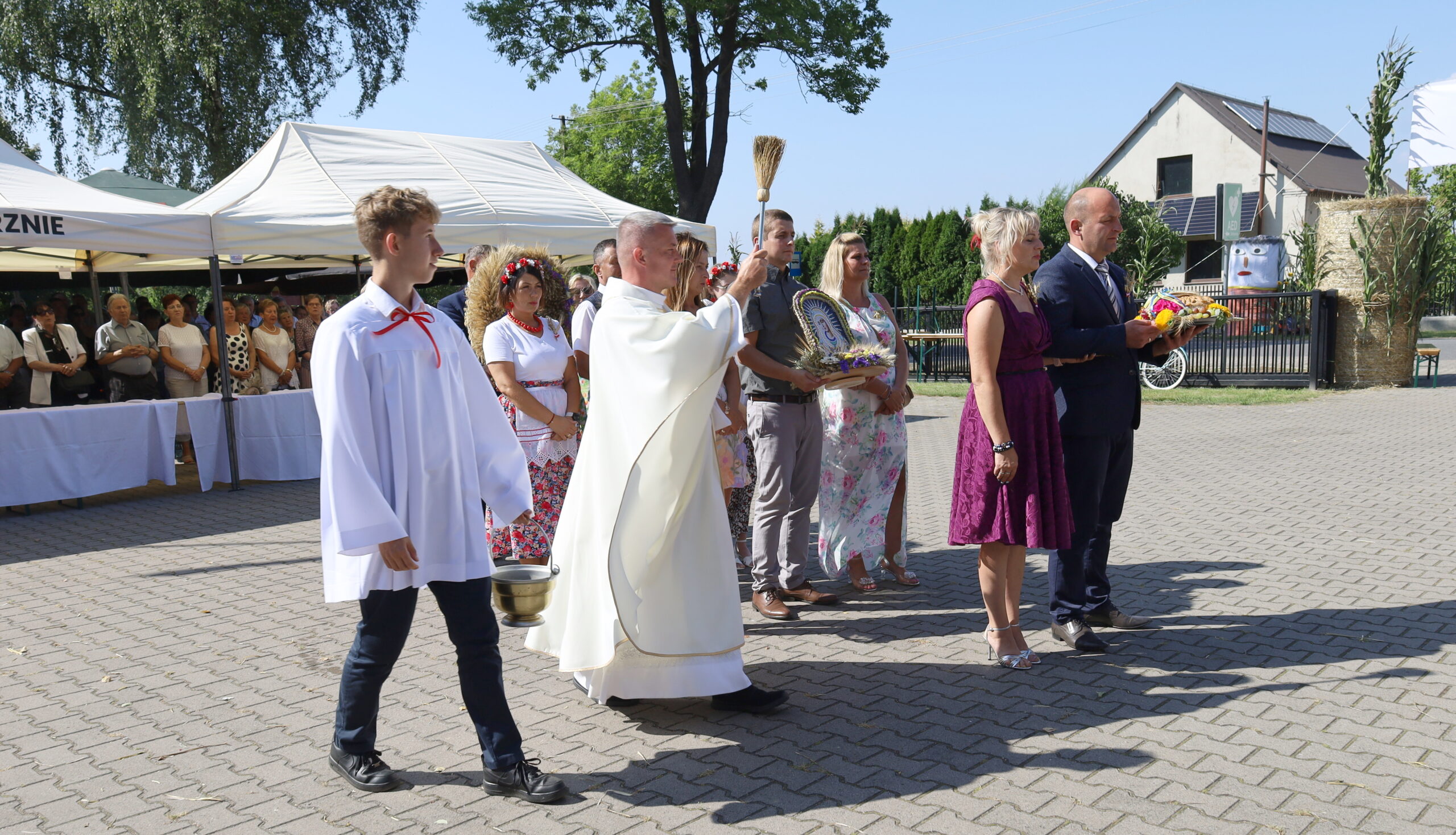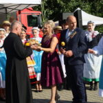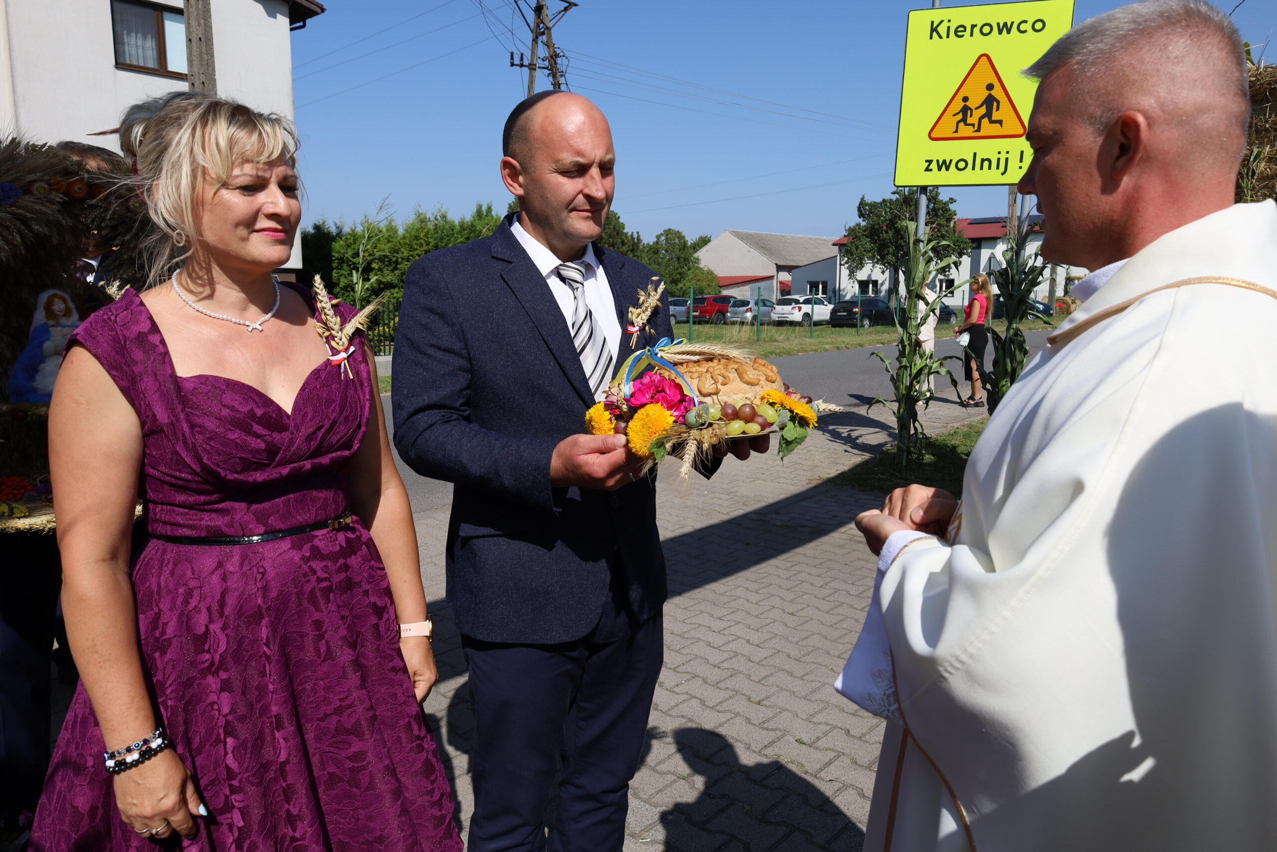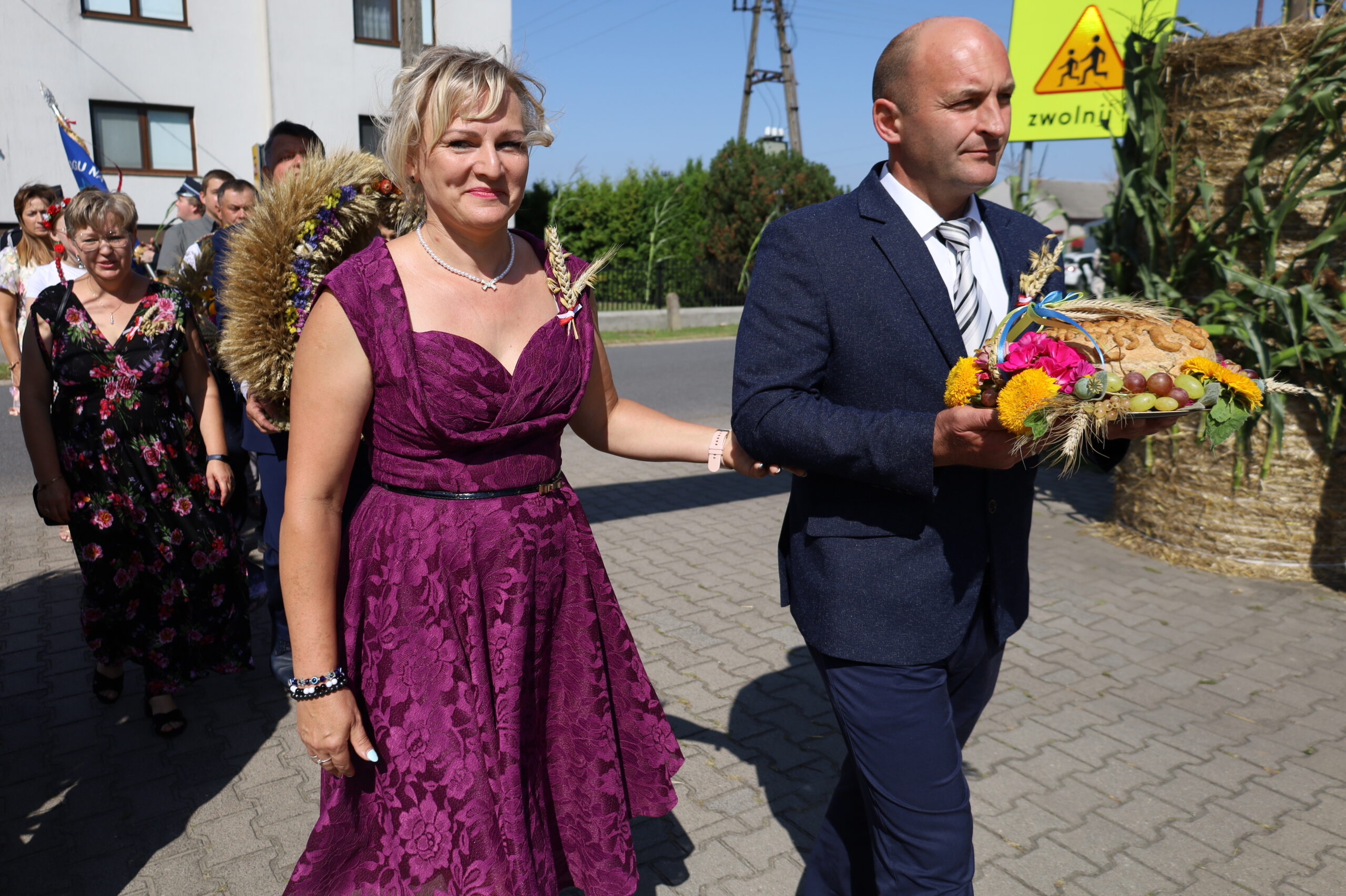 Uroczystość dożynkową prowadzili: Ada Białkowska w tradycyjnym stroju biskupiańskim oraz Krzysztof Popłonek w stroju raszkowskim.