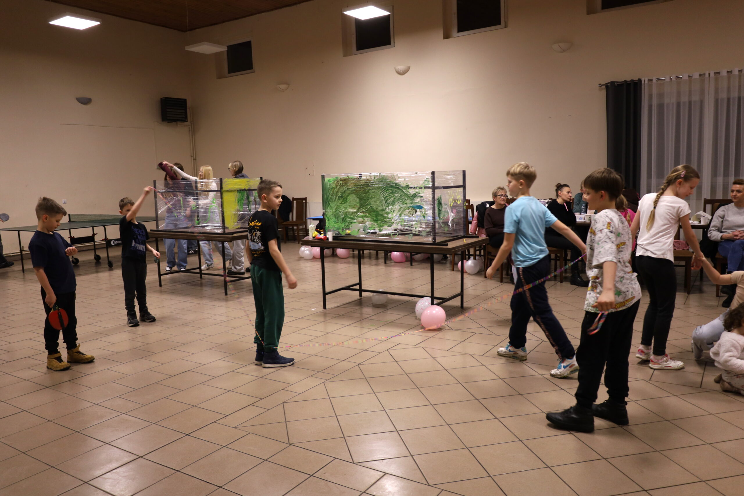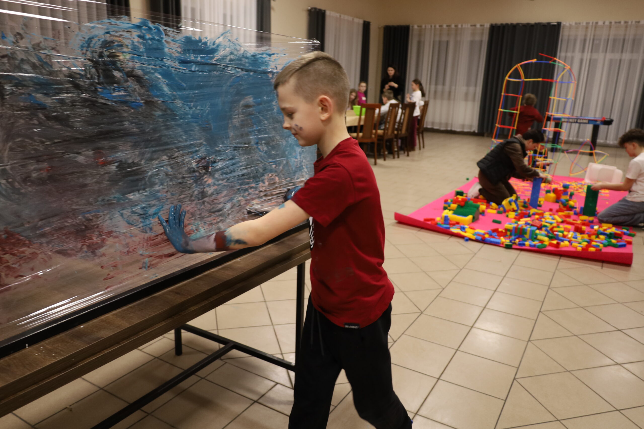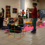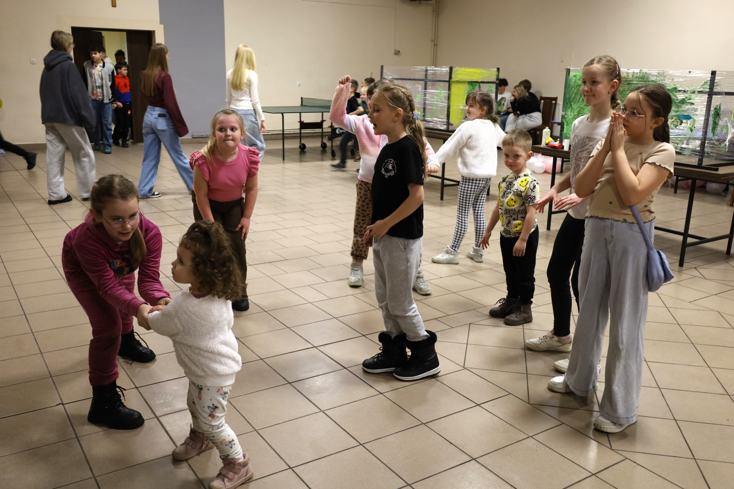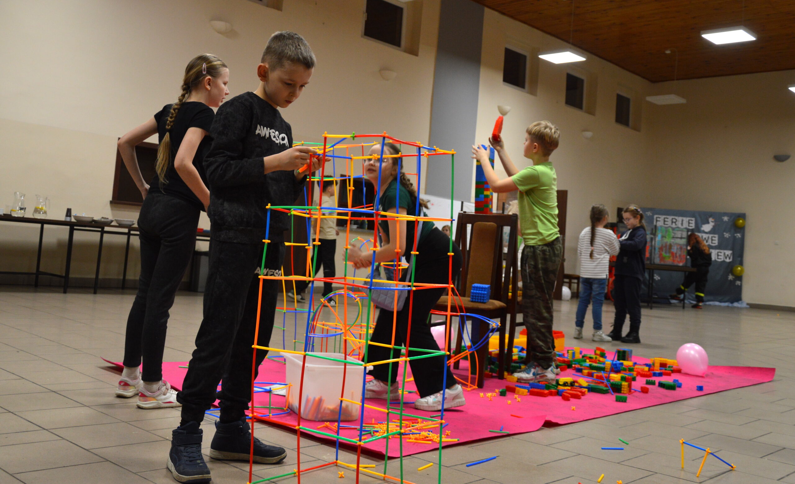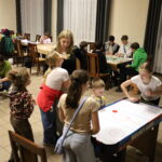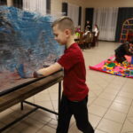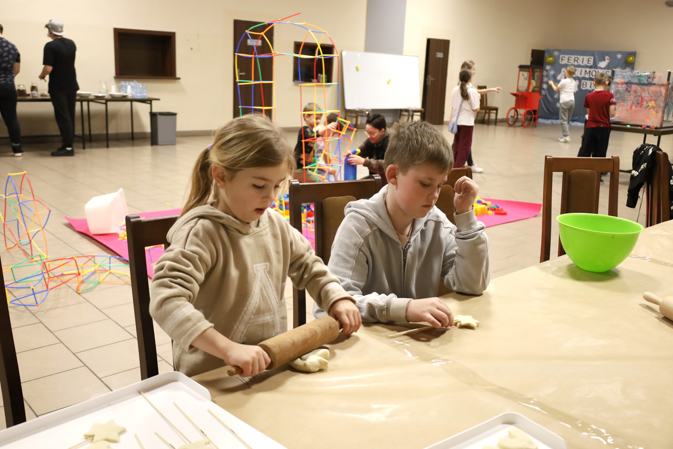 Na uczestników czekało mnóstwo atrakcji i różnorodnych zajęć. Organizatorzy zadbali o to, aby każdy dzień był wypełniony ciekawymi propozycjami. Dużym zainteresowaniem cieszyły się zabawy sensoryczne z masy solnej. Nie zabrakło również malowania farbami na folii strechowej. W programie znalazły się także sportowe emocje przy ping-pongu, cymbergaju i grach stolikowych. Wiele radości przyniosła zabawa ruchowa „taneczne posągi”. Dzieci z zaangażowaniem układały słomki konstrukcyjne oraz klocki, tworząc ciekawe budowle. Na wszystkich uczestników czekały również pieczone kiełbaski oraz popcorn.