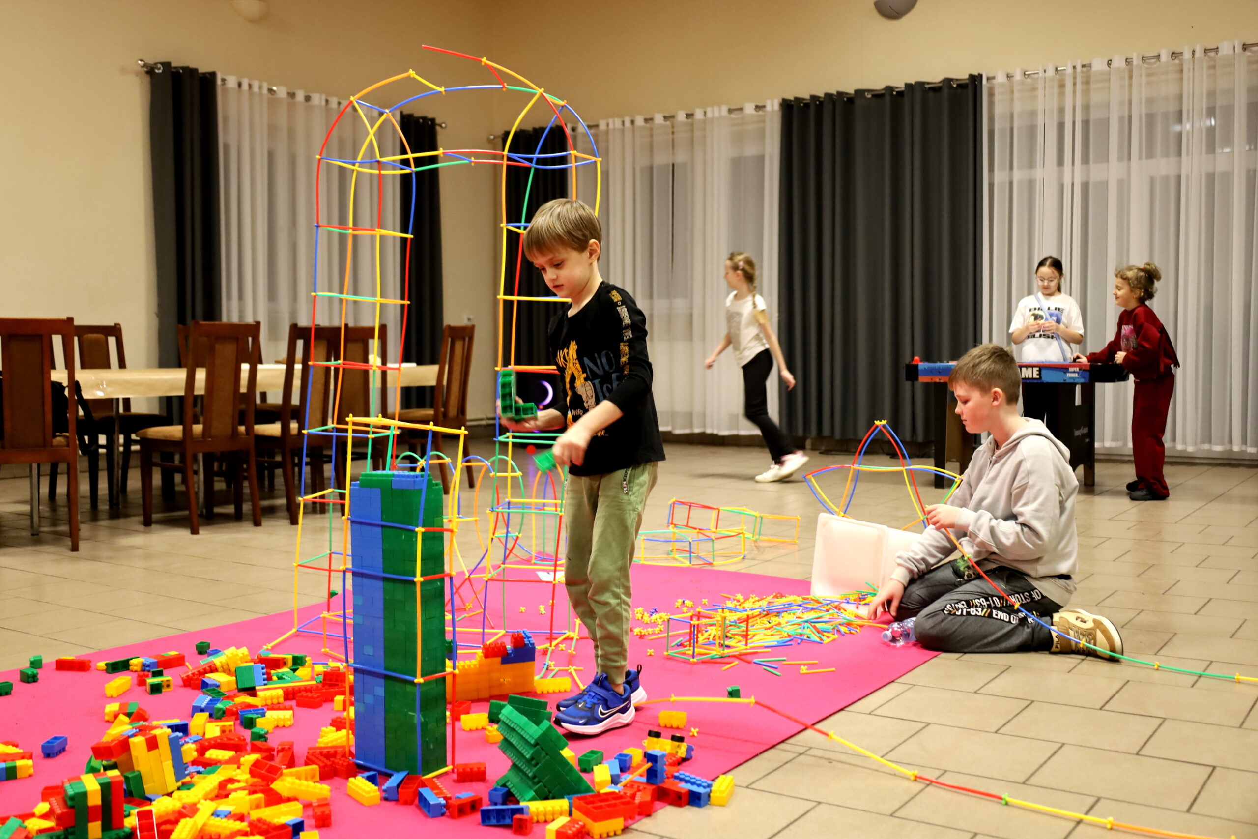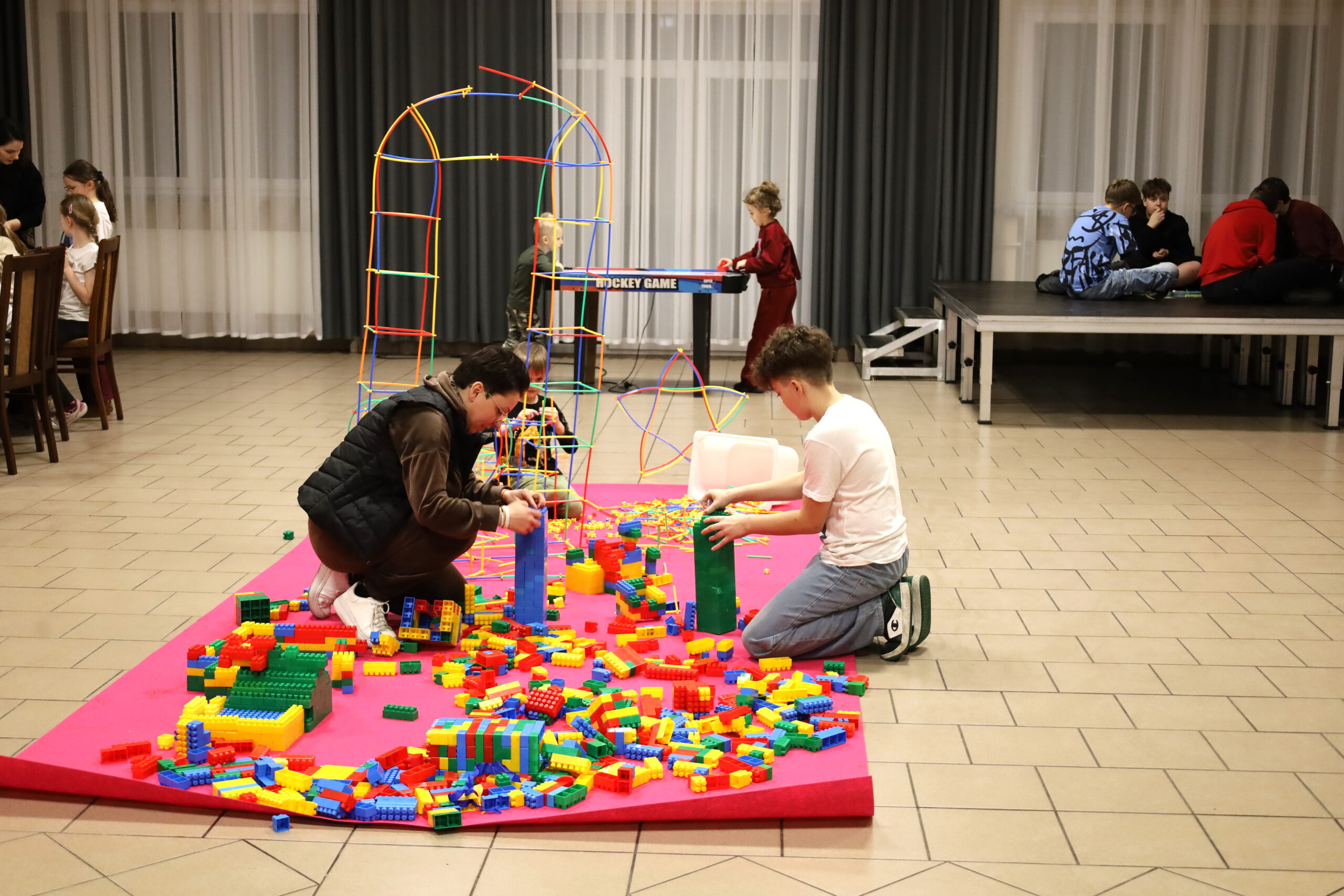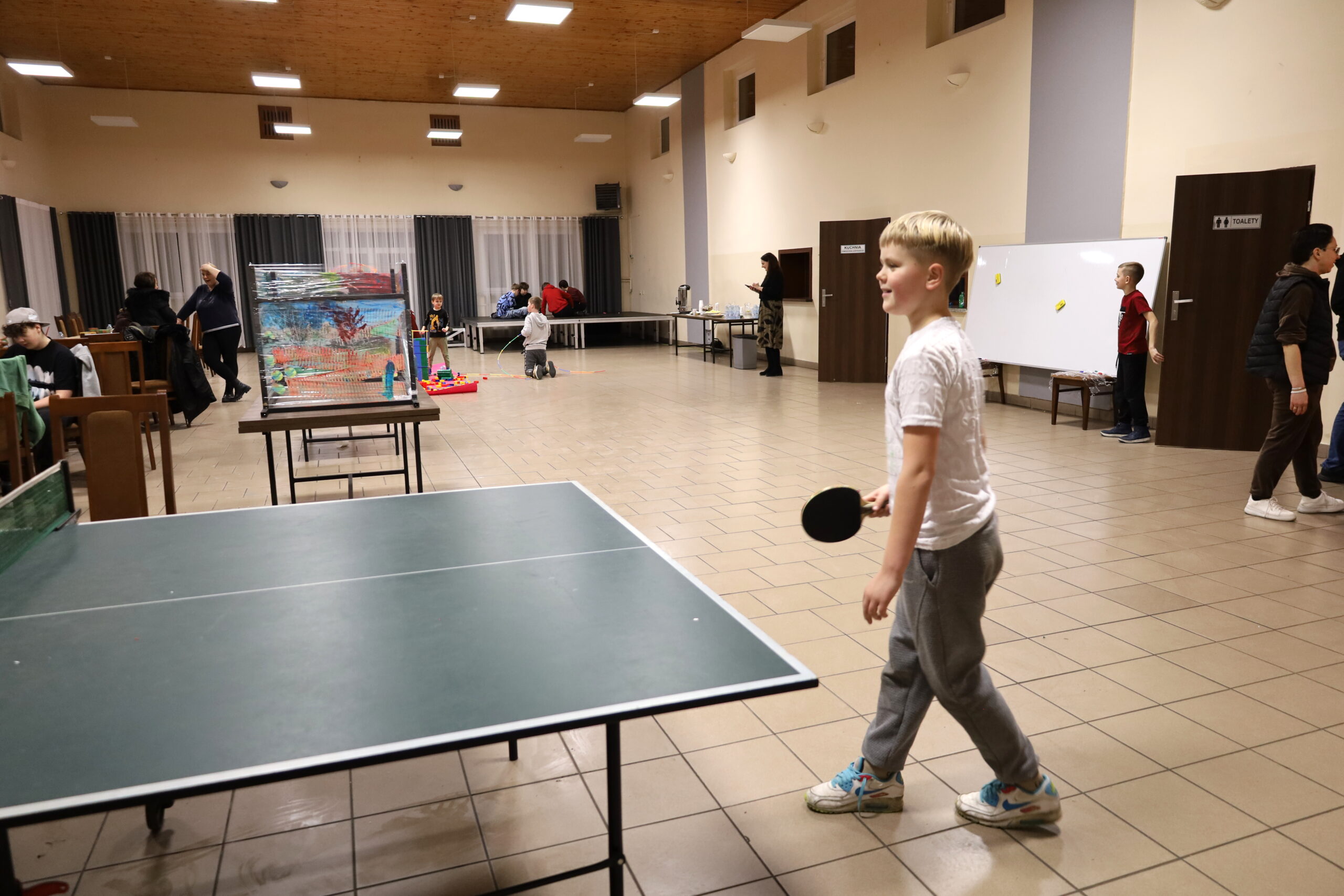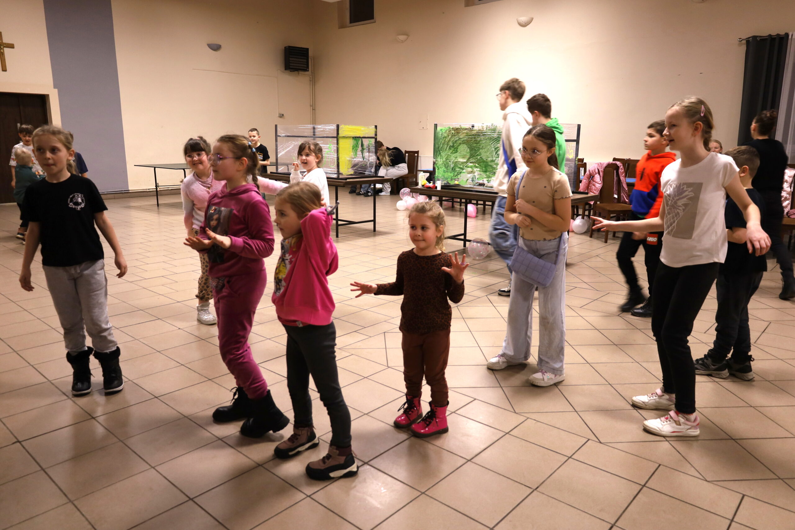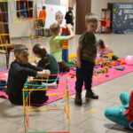 Na uczestników czekało mnóstwo atrakcji i różnorodnych zajęć. Organizatorzy zadbali o to, aby każdy dzień był wypełniony ciekawymi propozycjami. Dużym zainteresowaniem cieszyły się zabawy sensoryczne z masy solnej. Nie zabrakło również malowania farbami na folii strechowej. W programie znalazły się także sportowe emocje przy ping-pongu, cymbergaju i grach stolikowych. Wiele radości przyniosła zabawa ruchowa „taneczne posągi”. Dzieci z zaangażowaniem układały słomki konstrukcyjne oraz klocki, tworząc ciekawe budowle. Na wszystkich uczestników czekały również pieczone kiełbaski oraz popcorn.