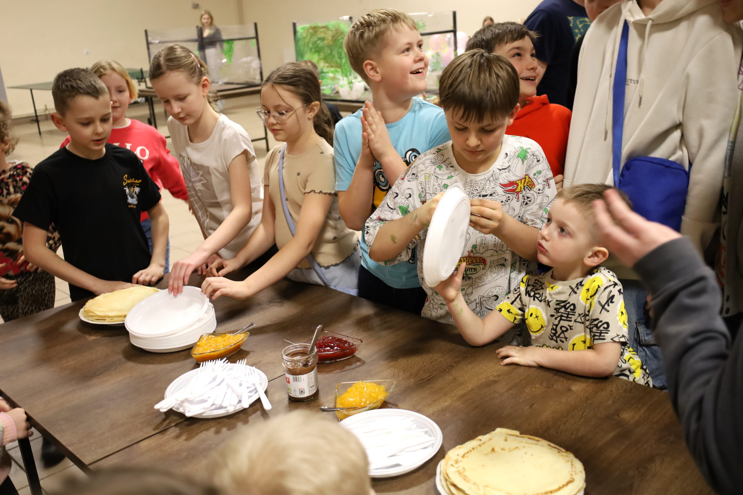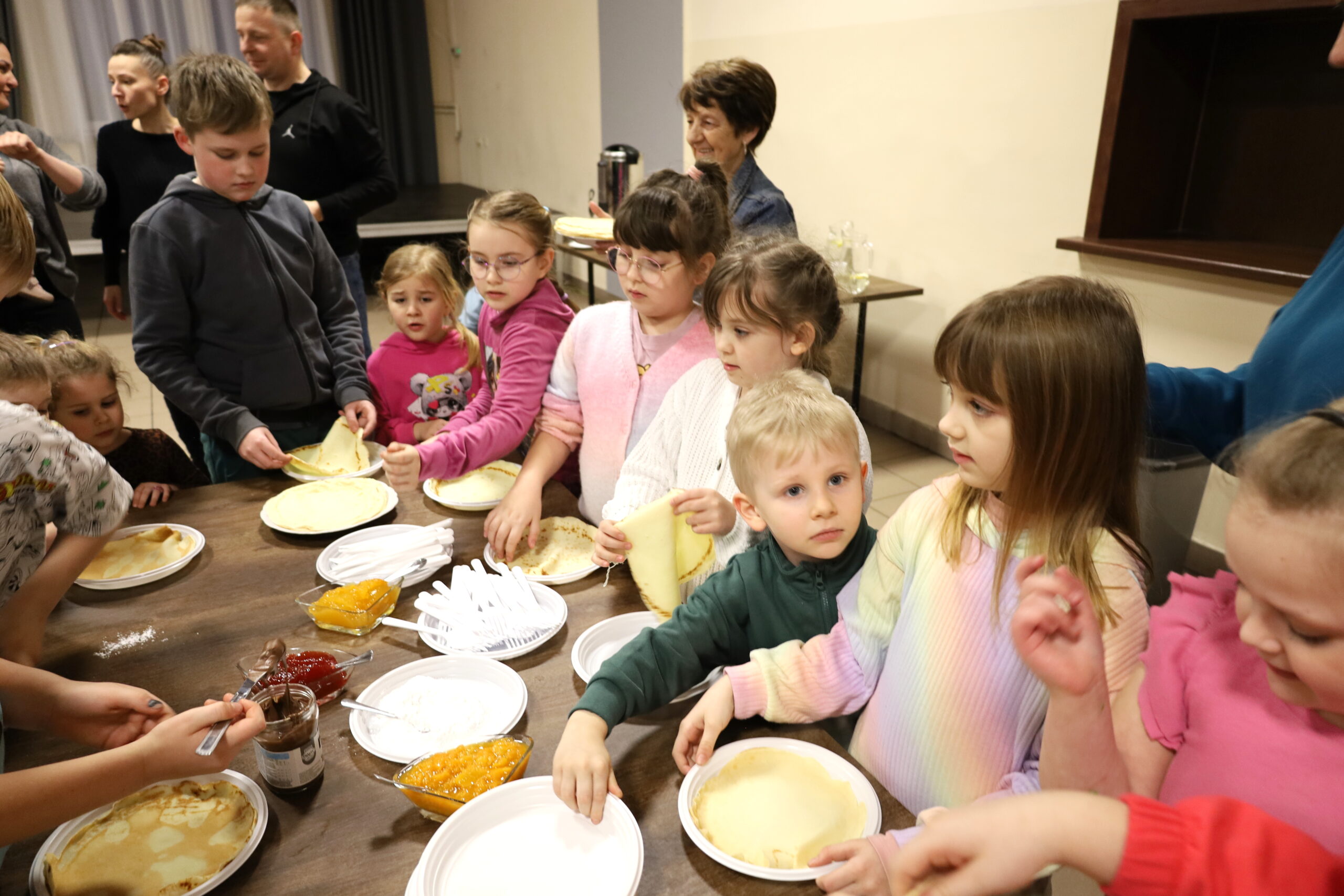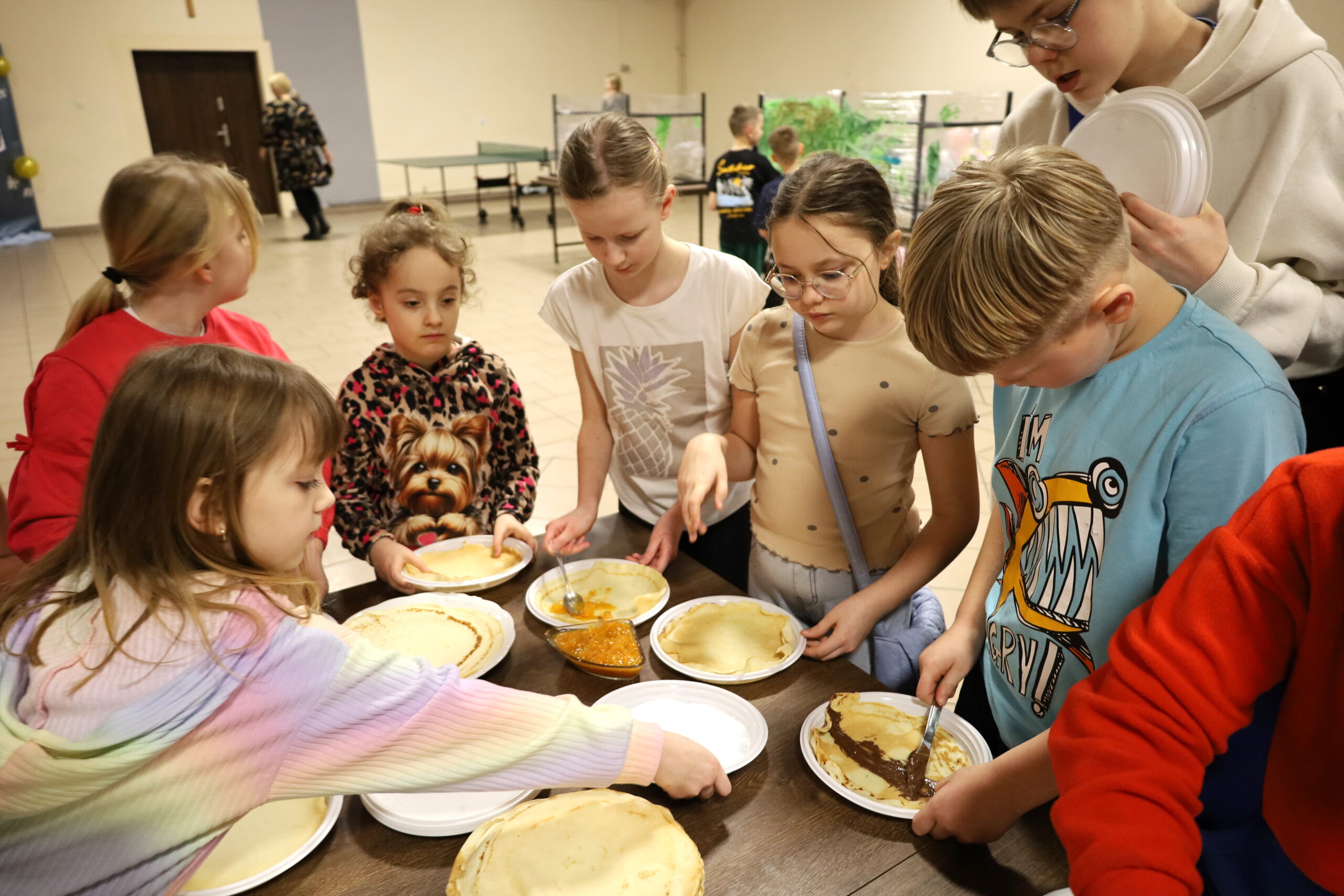 Panie z Koła Gospodyń Wiejskich chętnie zaangażowały się w organizację warsztatów kulinarnych. Na uczestników czekało ciepłe kakao oraz naleśniki z cukrem pudrem, konfiturą i nutellą.