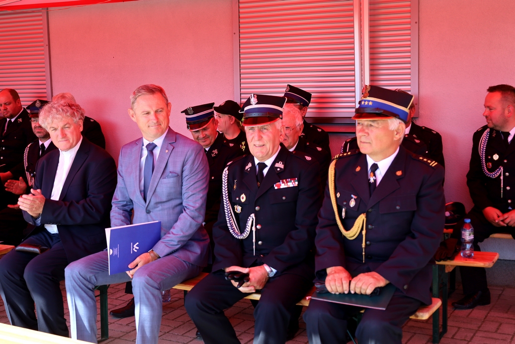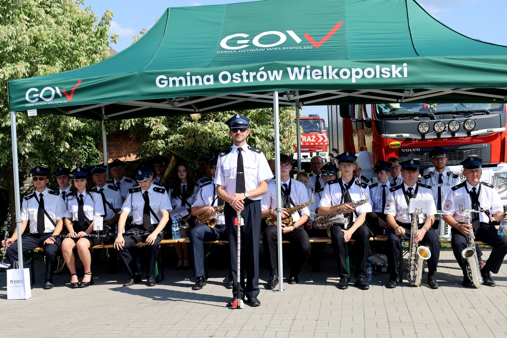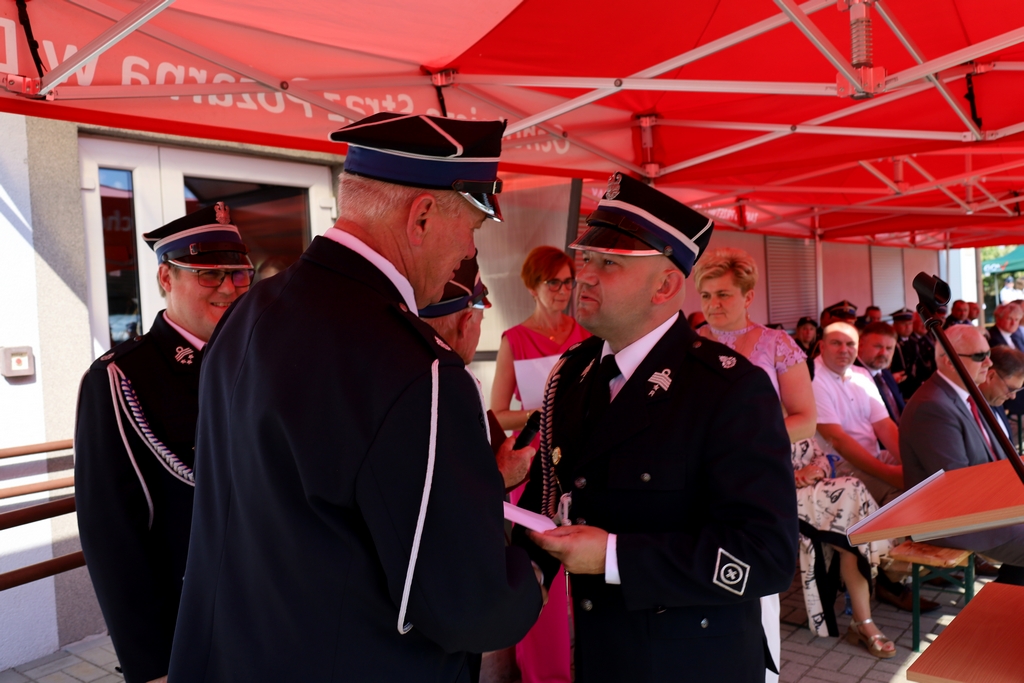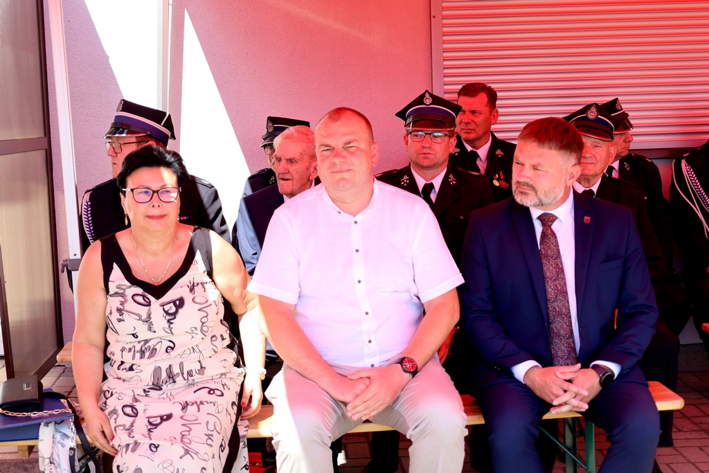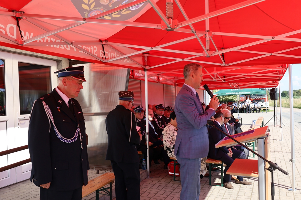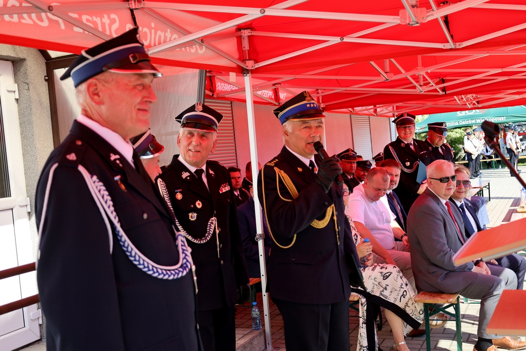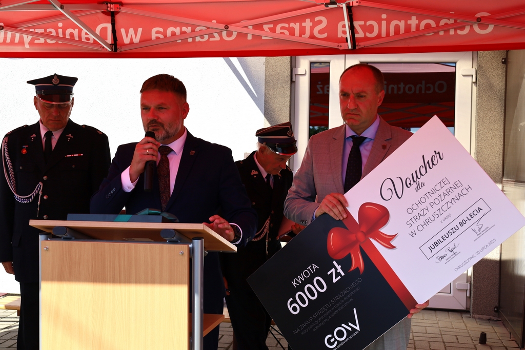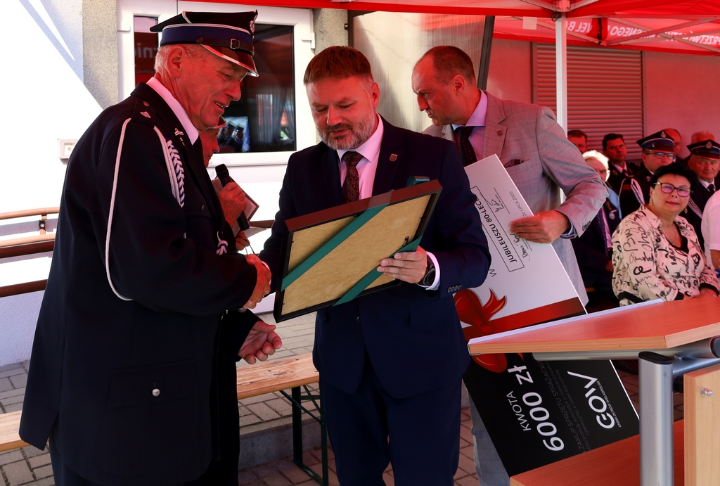 Podczas uroczystości jubileuszowych nie zabrakło słów uznania i podziękowań ze strony zaproszonych gości. Z tej okazji zastępca wójta gminy Ostrów Wielkopolski Paweł Małuszek oraz przewodniczący Rady Gminy Michał Szymoniak przekazali w imieniu gminy voucher o wartości 6000 zł na zakup niezbędnego sprzętu strażackiego.