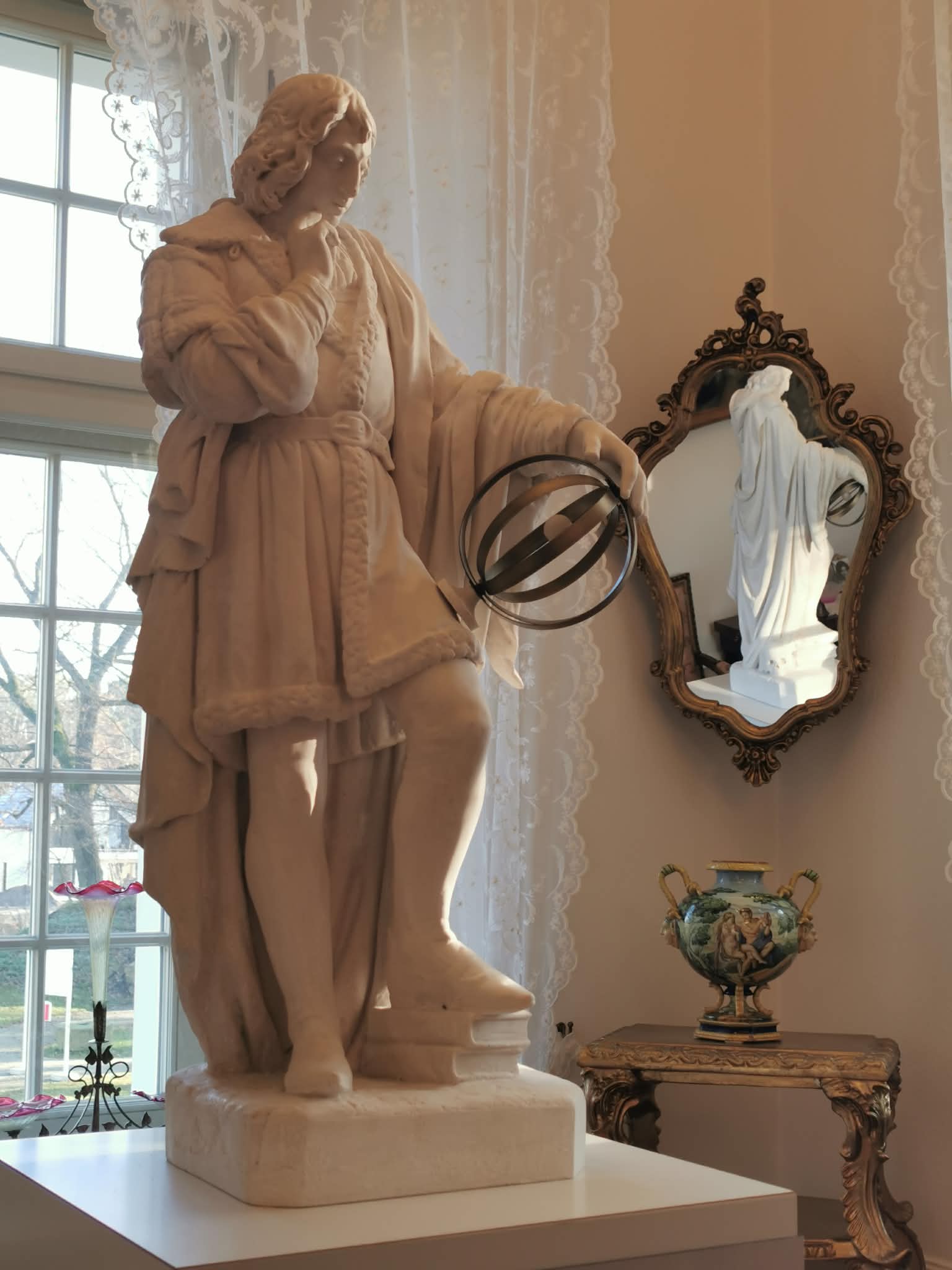 Lewkowska wersja rzeźby Kopernika pierwotnie była wykonana z białego alabastru, całość usadowiona była na postumencie z zielonego marmuru. Rzeźba umieszczona była w centralnej części Salonu Kopernika