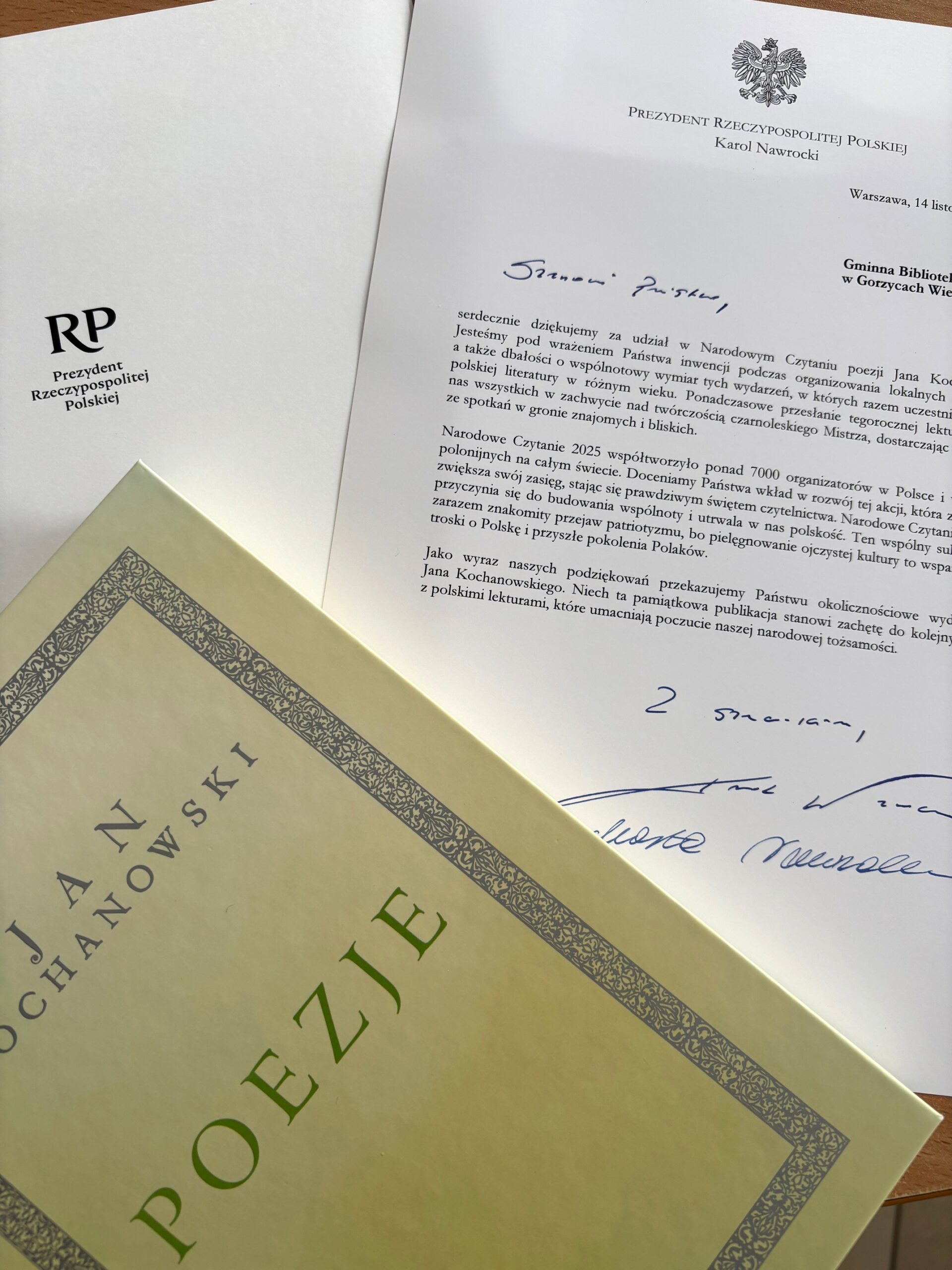 Gminna Biblioteka w Gorzycach Wielkich otrzymała od Pary Prezydenckiej list gratulacyjny za udział w ogólnopolskiej akcji Narodowego Czytania.