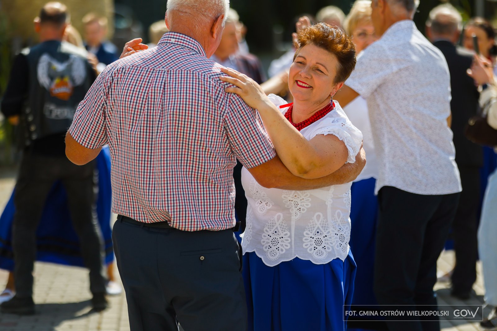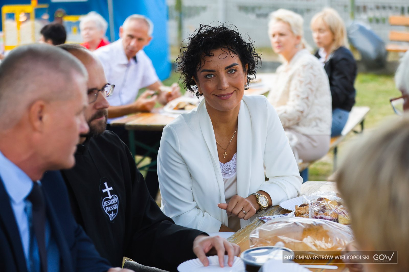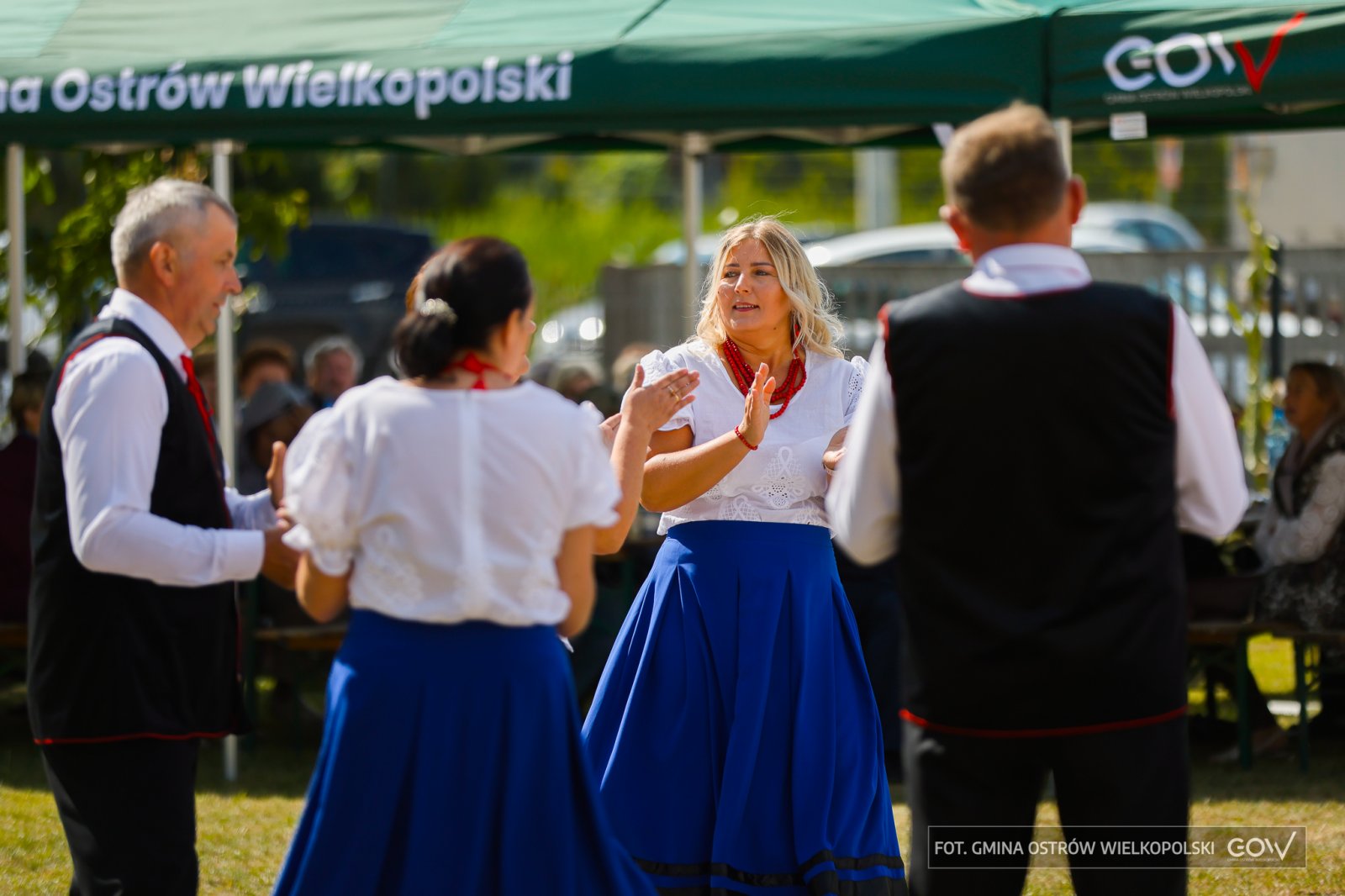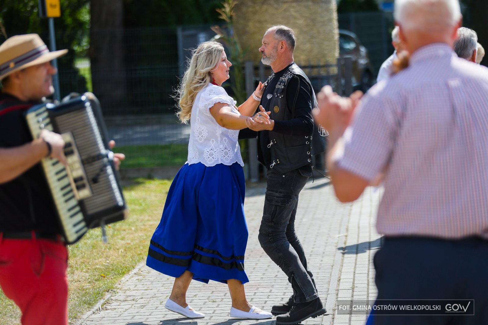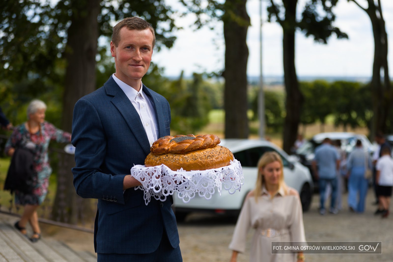 Starostowie dożynek, Magdalena Fibik i Krzysztof Brdęk, podzielili się z mieszkańcami symbolicznym chlebem, co podkreśliło charakter święta plonów.