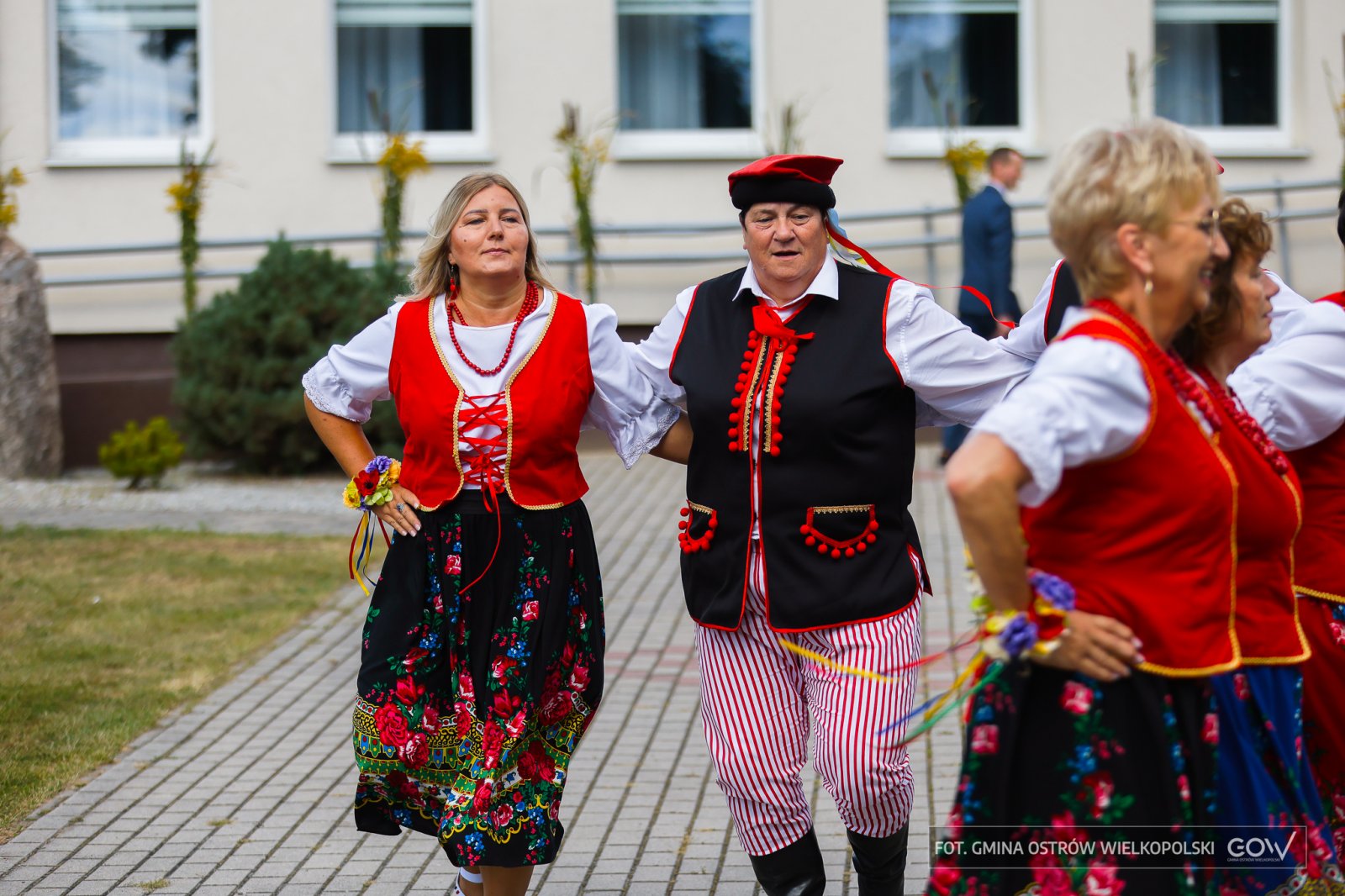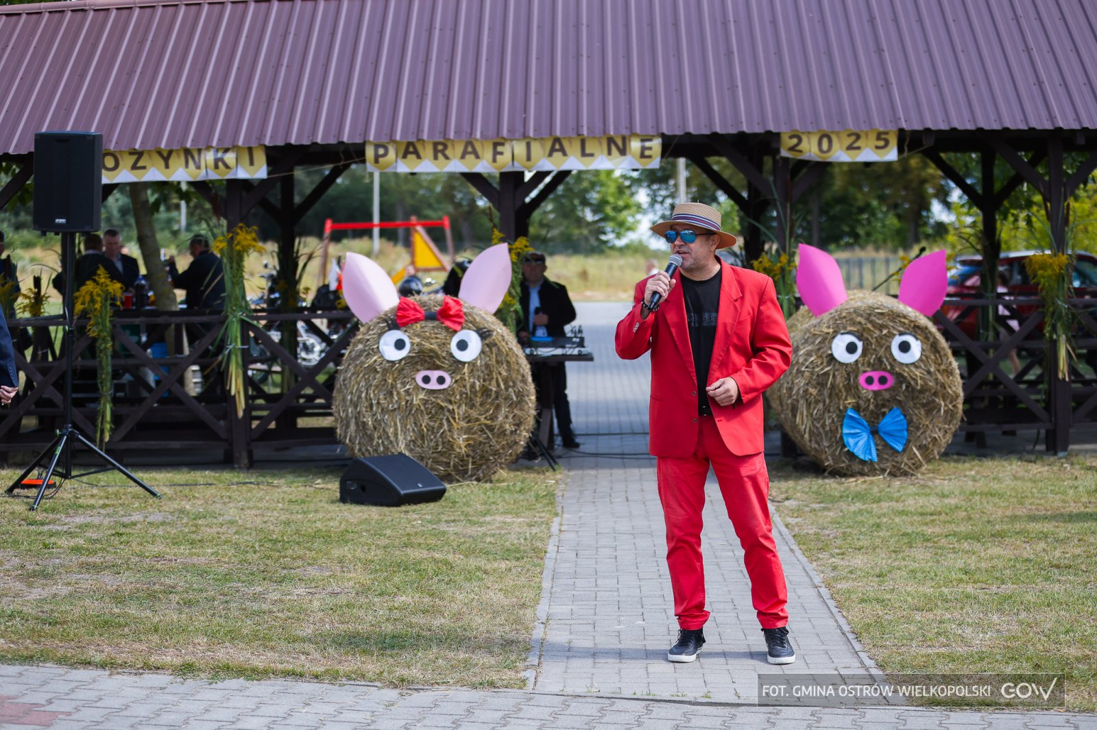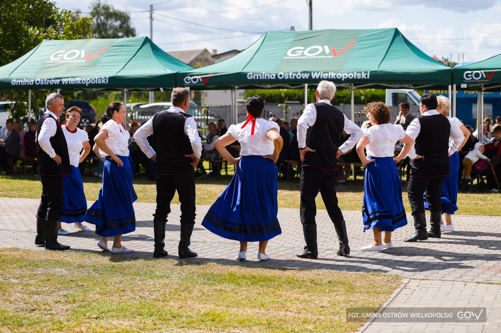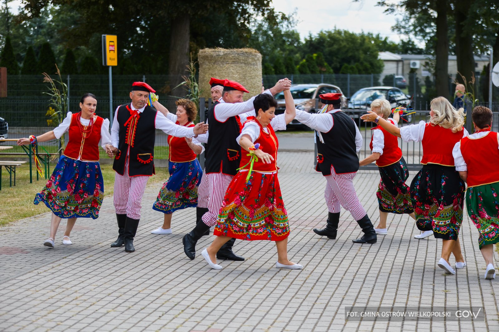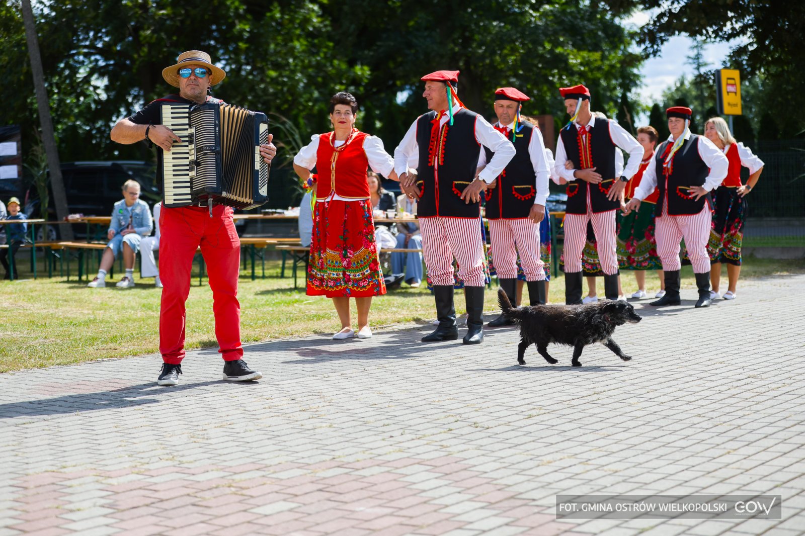 Starostowie dożynek, Magdalena Fibik i Krzysztof Brdęk, podzielili się z mieszkańcami symbolicznym chlebem, co podkreśliło charakter święta plonów.