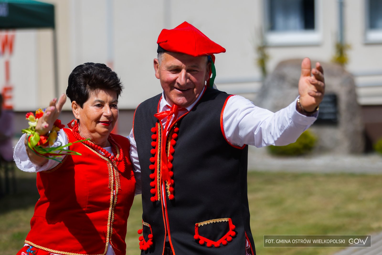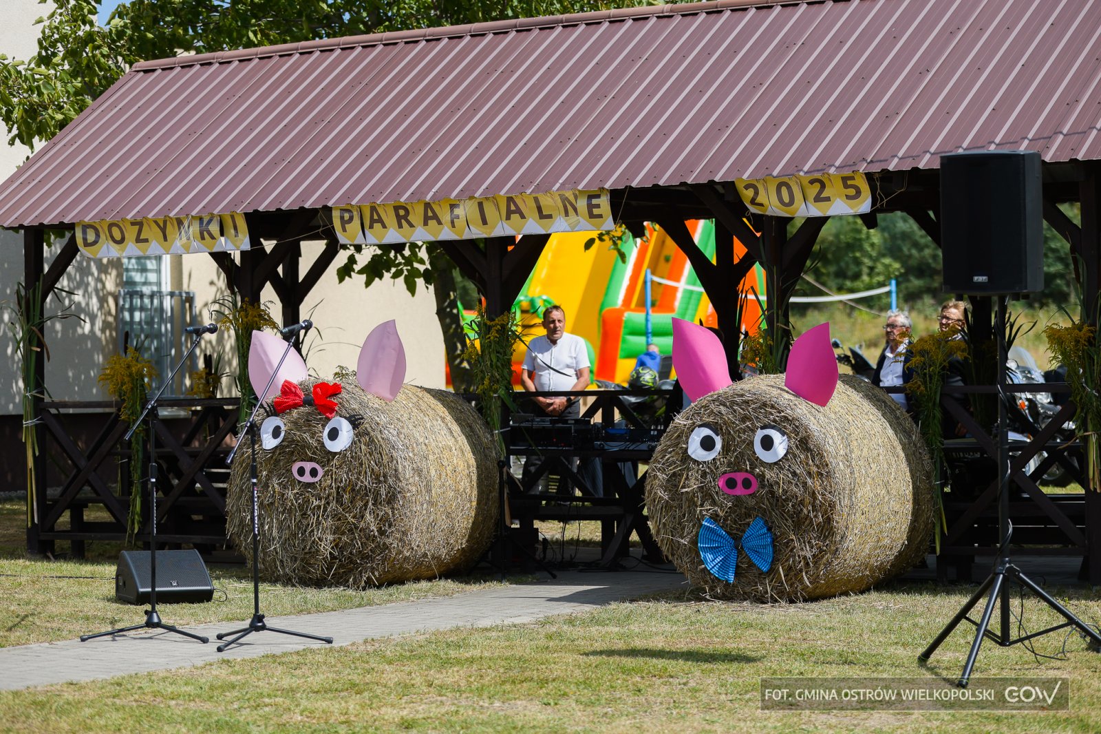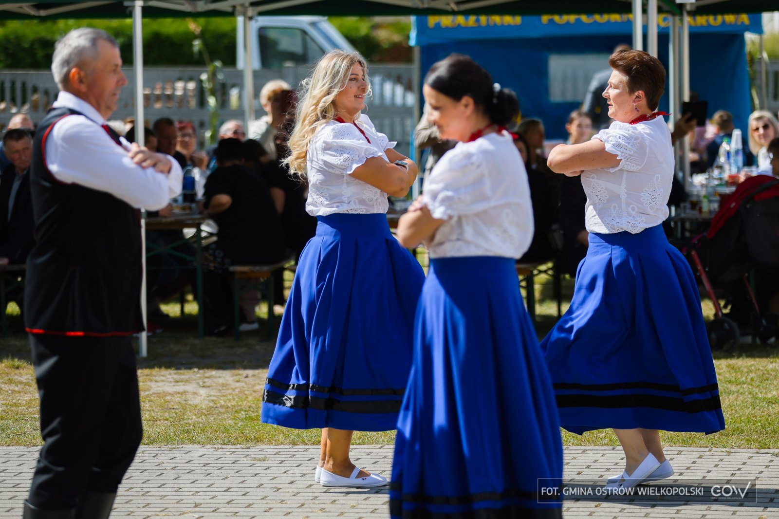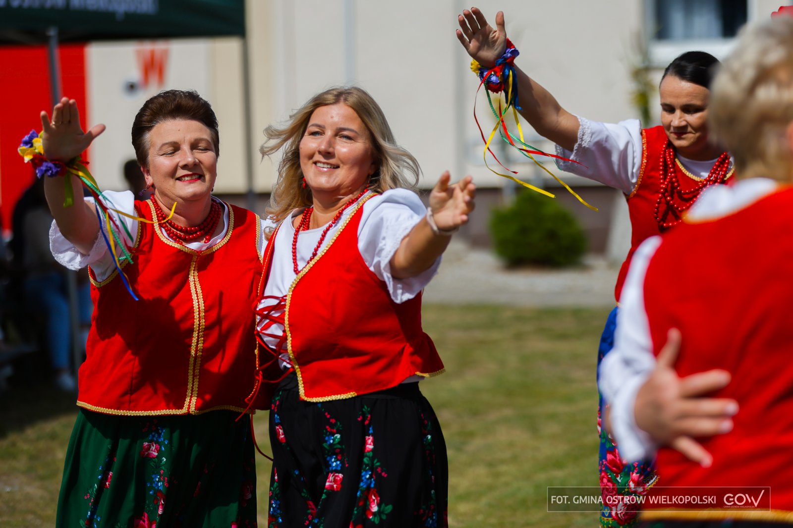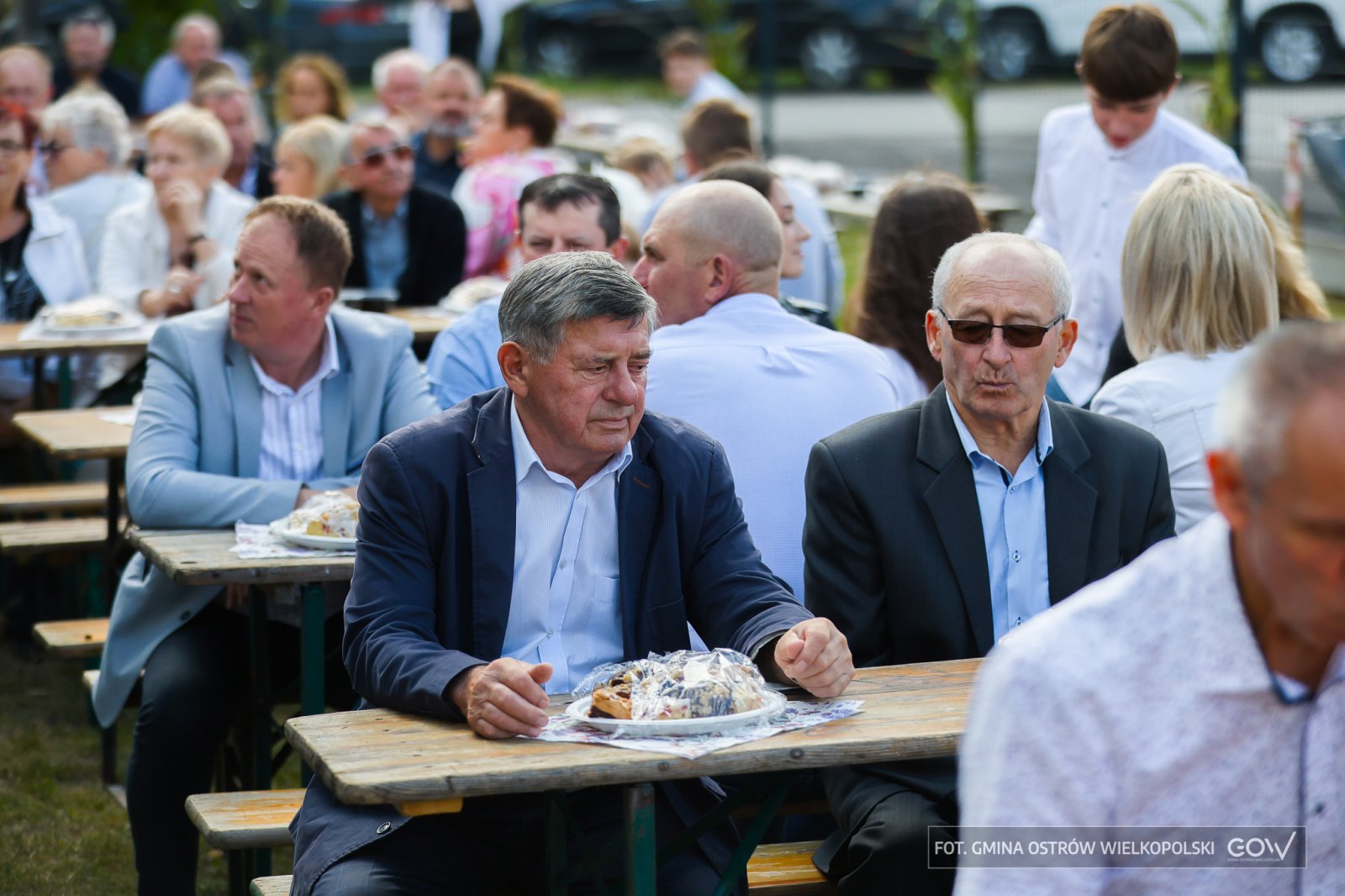 Starostowie dożynek, Magdalena Fibik i Krzysztof Brdęk, podzielili się z mieszkańcami symbolicznym chlebem, co podkreśliło charakter święta plonów.