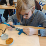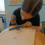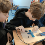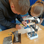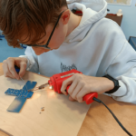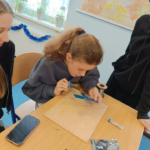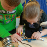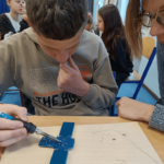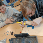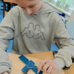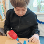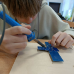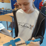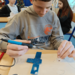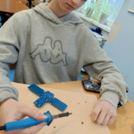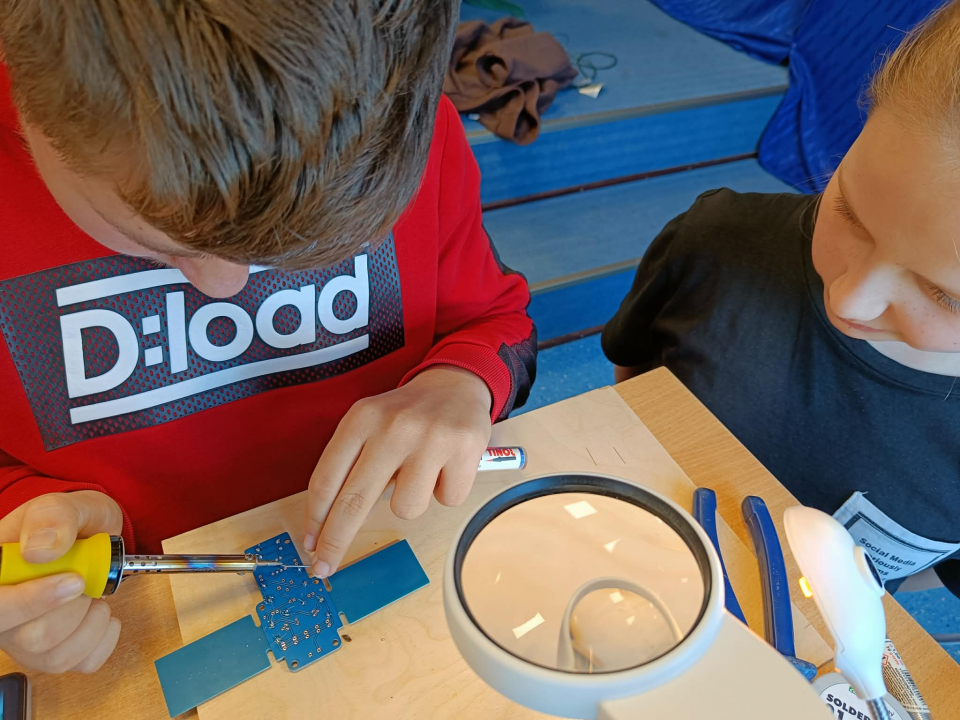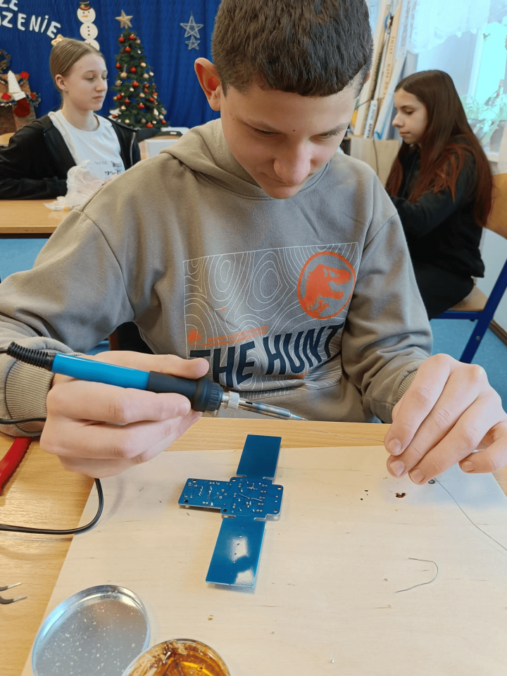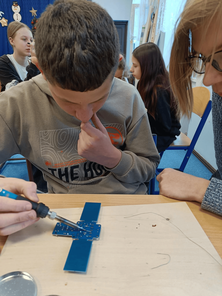 Szczególnie interesującym i angażującym etapem zajęć była praca z lutownicami. Uczniowie rozpoczęli od zapoznania się z zasadami bezpieczeństwa oraz podstawami lutowania. Następnie, krok po kroku, uczyli się łączenia elementów elektronicznych na płytce PCB. Każdy uczestnik montował kolejne części układu, takie jak diody czy przewody, ćwicząc precyzję, cierpliwość i dokładność.